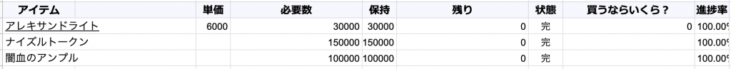 アレキは、全てアンバス産でクリアしました。2番目に早く達成できた項目ですが達成そのものは半年以上前になります。次のための貯蓄も進んでいて既に1万個を超えています。