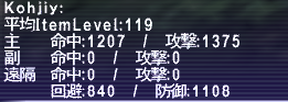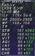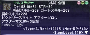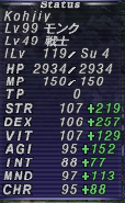 前回からの差分を見てみると/checkparamで見える数値では攻撃と防御が20くらい落ちています。ステータスは、STRが35上がっています。その他は微減ってところです。