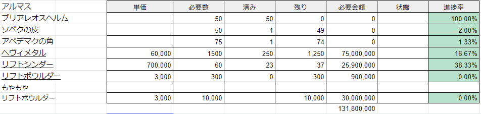 NM素材以降のヘヴィメタル、リフトシンダー、リフトボウルダーってかなり安くなってますね。こちらも少しずつ貯めていきたいと思います。
