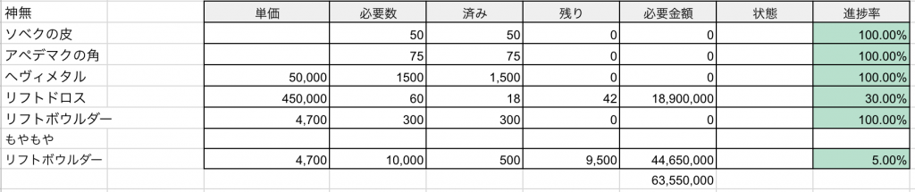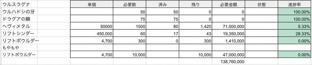 神無のヘヴィメタルが終わったので、かなりお待たせしてたウルスラグナの強化も再開しています。まだまだ先は長いです。先に交換を始めているリフトシンダーについては入力済みにしています。