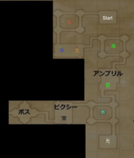 スタート → 火エレゾーン(パス) → 氷エレゾーン(殲滅) → 土エレゾーン(パス) → 風エレゾーン(パス) → アンブリル