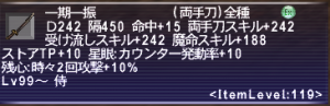 ギアスフェットNMKammavaca」がドロップするジョブ専用武器になります。侍は上げていないので、倉庫ちゃんに大事に取っておきたいと思います。