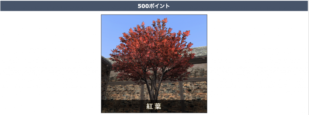 500ポイントで取得できる「紅葉」です。モグハウス中庭の彩が増しますね。その他にも植物系の置物がいくつか設定されているようです。