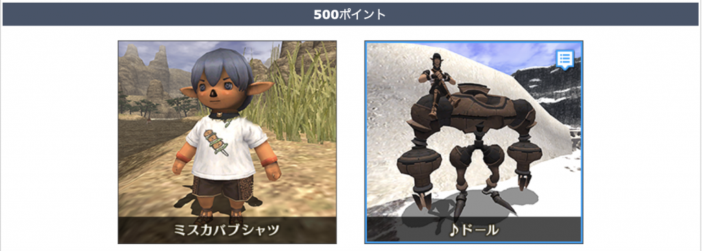 500ポイントで取得できる「ミスカバブシャツ」と「♪ドール」です。