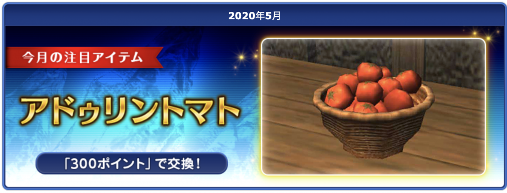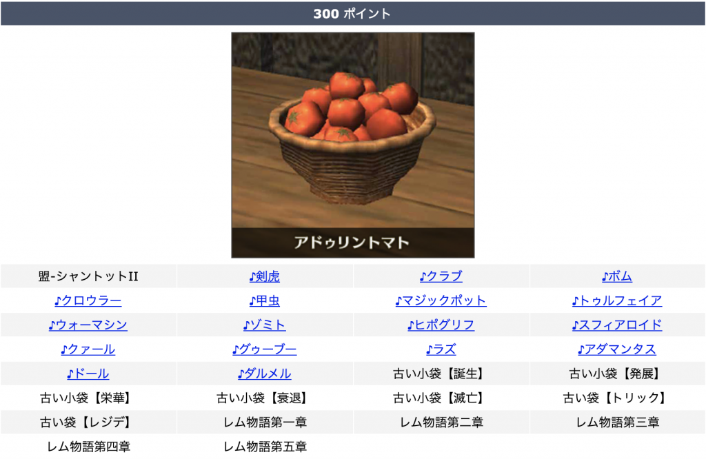 300ポイントで取得できる「アドゥリントマト」です。2018年のイベントで入手可能だったものになります。その他にも各種乗り物やフェイスのシャントット2があります。シャントット2は魔攻が高くて1系での攻撃にも関わらず大きなダメージを与えてくれます。また、TPがたまるとWSにより連携を作ってくれて自分でMBまでやってくれるとても有効なフェイスになっています。復帰したばかりで持っていない人はこの機会にぜひ手に入れてください♪