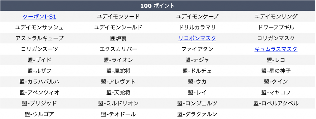 100ポイントにもフェイスが並んでいます。まだ持っていない人はゲットゲット、フェイスの強化クエスト「絆パワーですわ!」を受けるための条件には、フェイスの習得数が86以上になっていることってのがあるので、使わないフェイスでも持っておくと良いですよ!