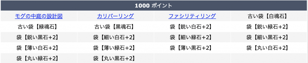 1000ポイントには各種石+2になります。オーグメントをつける石ですが競売ではストック99個になった影響でかなり買いにくくなってしまいました。ちょっと挑戦してみる程度ならここでもらうのも良いかもしれません。金策としては他にもっと良いものがあります。