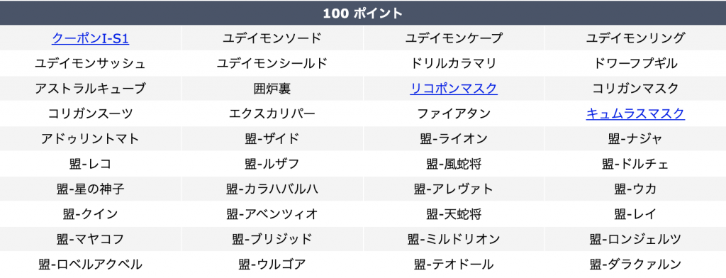 100ポイントには、フェイスがたくさんありました。復帰者は初心者はここで手に入れてはいかがでしょうか。